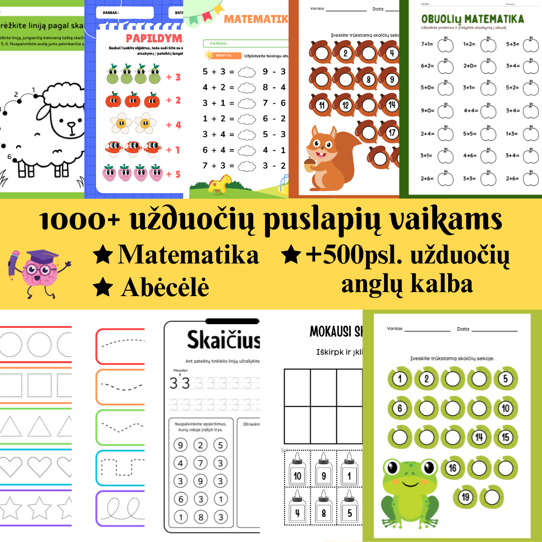 1000 užduočių PDF puslapių vaikams + 1000 PDF Lapų spalvinimui + BONUSAI