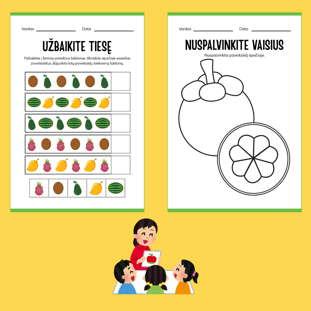 Spalvingos vaisių užduotėlės vaikams PDF formatu, skirtos mokymuisi namuose ir darželyje. 25 spausdinamos užduotėlės vaikams PDF padeda lavinti kalbą, skaičiavimą, loginį mąstymą, dėmesį ir smulkiąją motoriką.