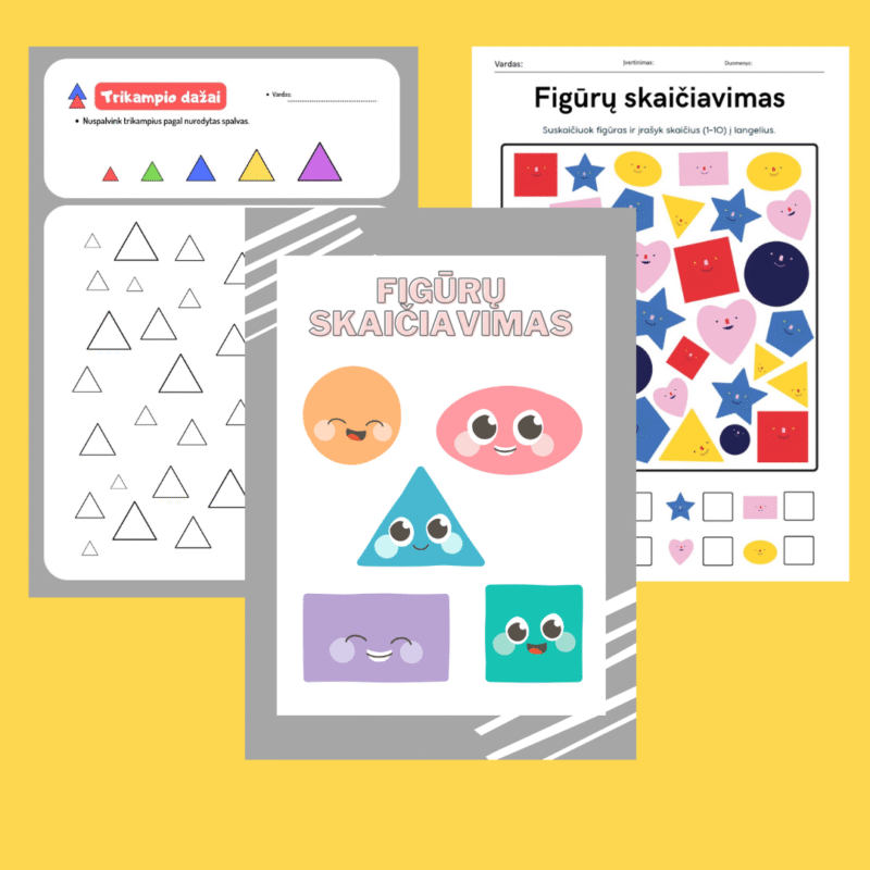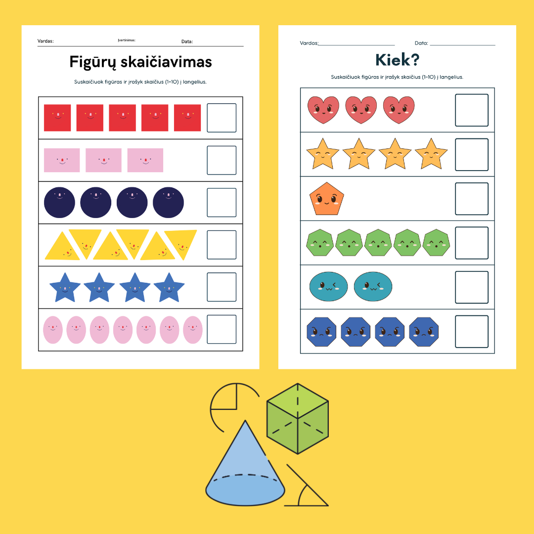 Smagios ir lavinančios figūrų skaičiavimo užduotys vaikams atsispausdinti! 20 puslapių PDF rinkinys padės vaikams mokytis skaičiuoti, pažinti geometrines figūras ir lavinti loginį mąstymą per žaidimą.
