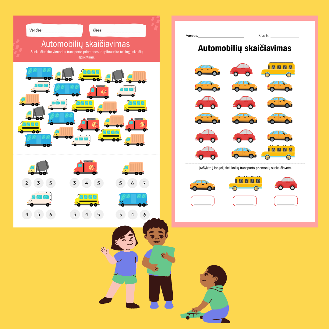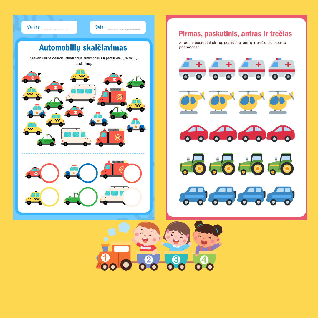 Smagios ir įtraukiančios sudėties užduotėlės vaikams su automobilių tema! PDF rinkinyje rasite 21 puslapį įvairių skaičiavimo, dėmesio ir loginio mąstymo lavinimo užduočių, kurias lengvai atsispausdinsite.