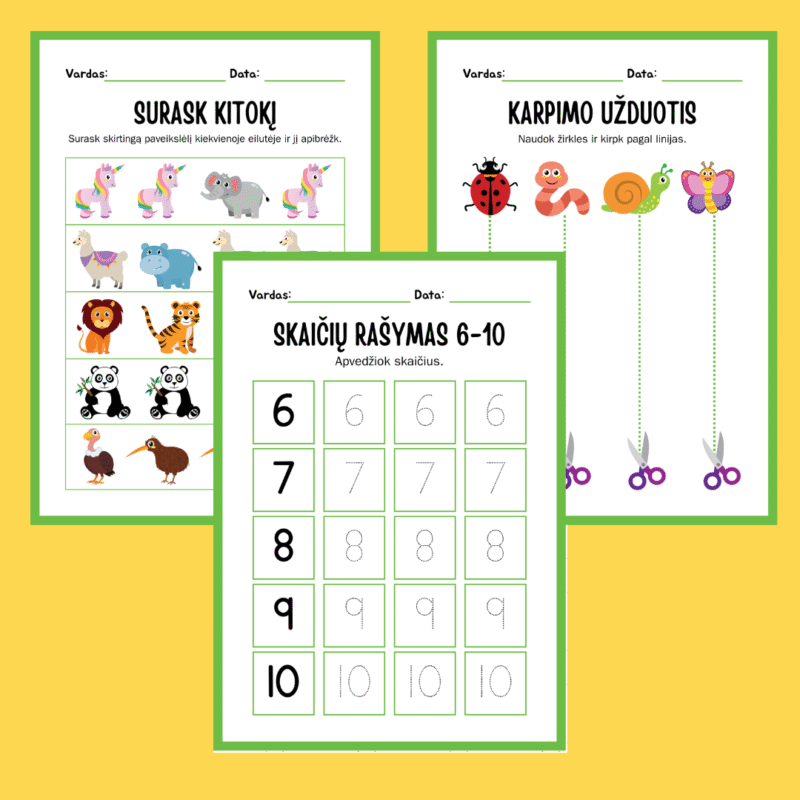 Čia rasite įvairias užduotys vaikams pateiktas PDF failais, kad galėtumėte patogiai atsispausdinti ir naudoti namuose, darželyje ar mokykloje. Visi užduočių lapai paruošti PDF formatu, todėl pakanka juos atsisiųsti ir atsispausdinti tiek kartų, kiek reikia.