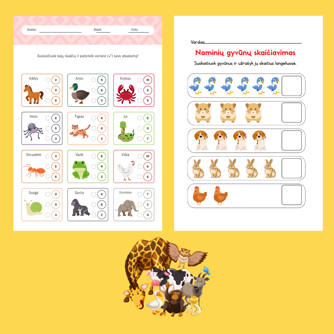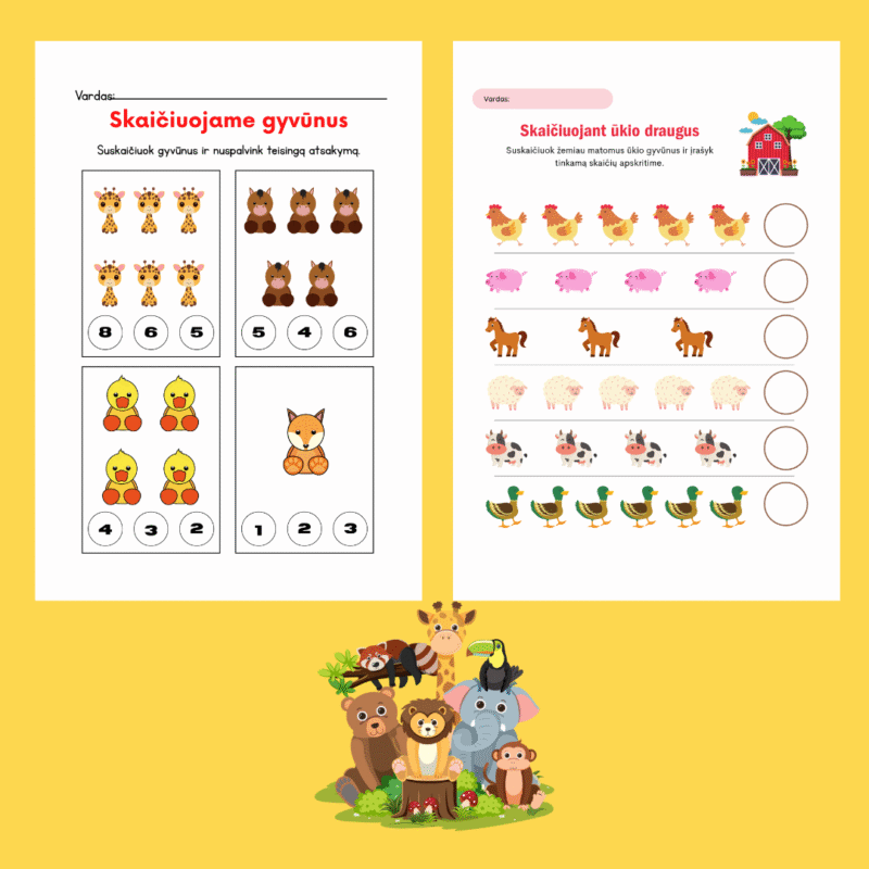 3.50€Gyvūnų skaičiavimo užduotėlės vaikams PDF | užduotys atsispausdinti (30 puslapių)