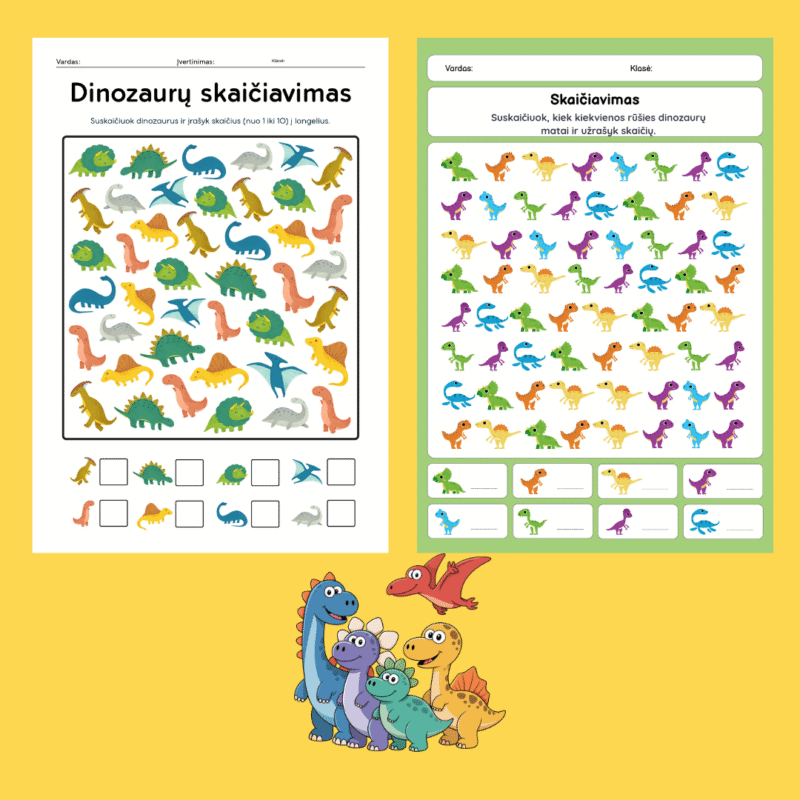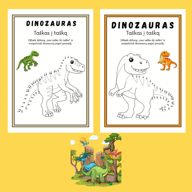 Tai idealios užduotys vaikams atsispausdinti, kurios padės mokytis per žaidimą su mėgstamais dinozaurais! 🦕