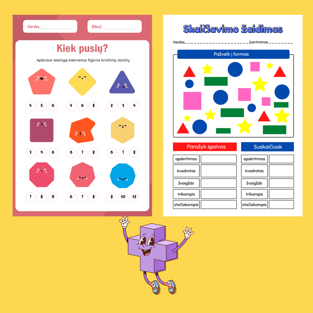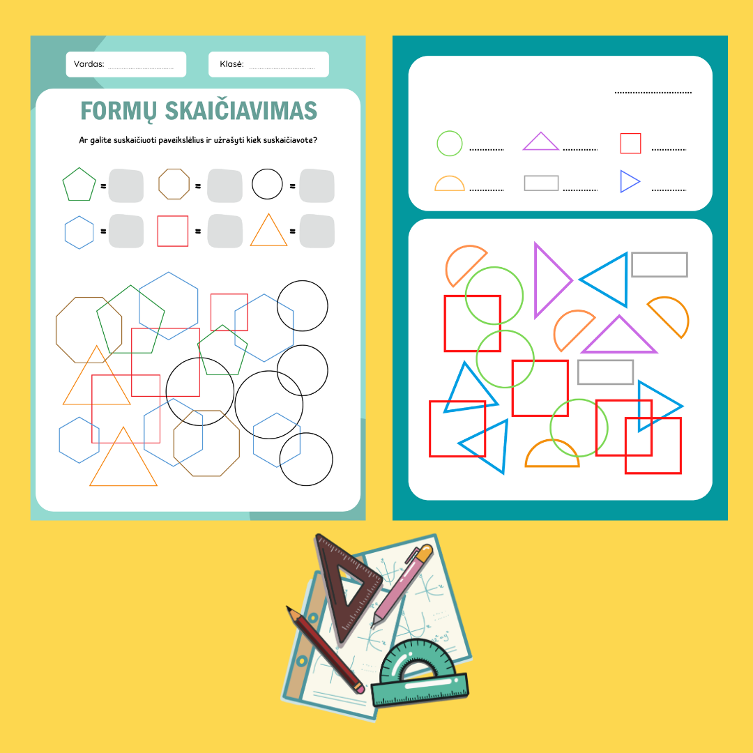 Šis rinkinys išsiskiria tuo, kad užduotys vaikams atsispausdinti yra ne tik mokomosios, bet ir labai įtraukiančios. Vaikai mokosi per žaidimą – skaičiuodami formas, lygindami jas ir spręsdami smagias užduotis.